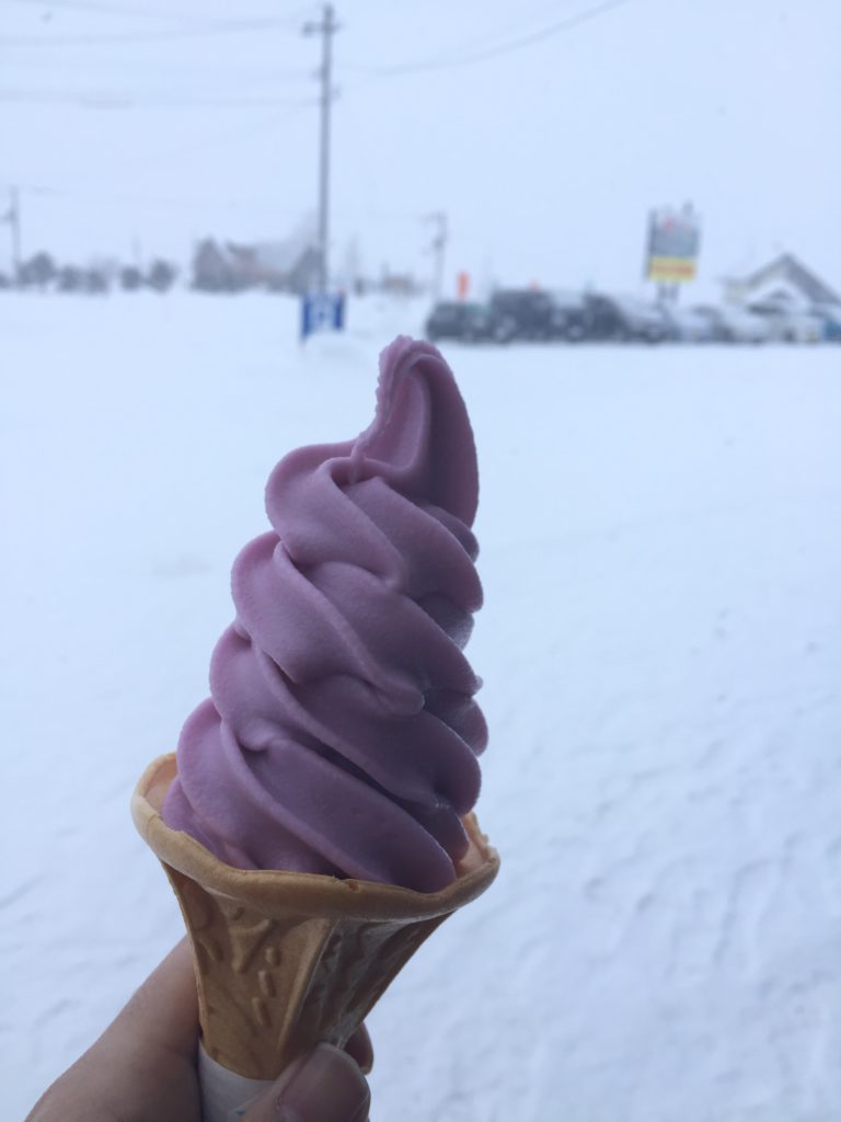 吹雪の中食べるラベンダー味のソフトクリームは◎。