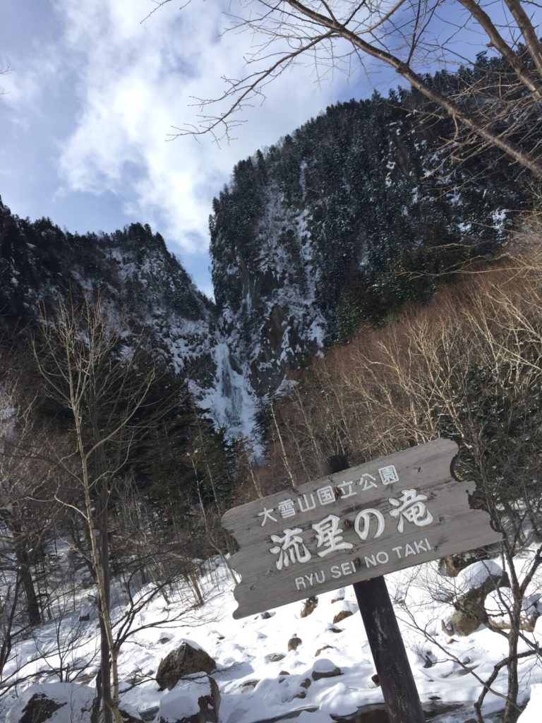「不動岩」を挟んで流れる、細く繊細な白糸のように優美な姿で流れ落ちる「銀河の滝」と太い1本の滝となって力強く流れ落ちる「流星の滝」。