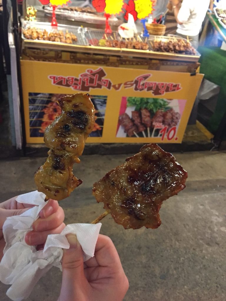 ラチャダー鉄道市場にあるお店。ムーピン(豚串焼き)、ヌアピン(牛串焼き)を食す。
