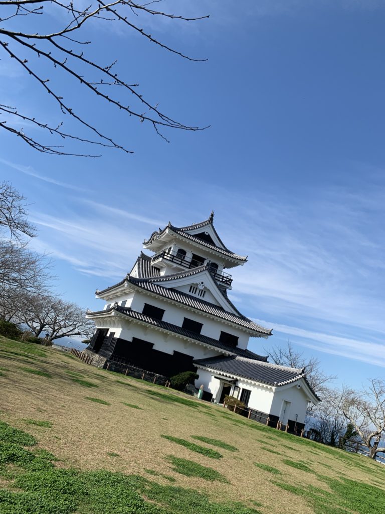 城山の頂上にある居城跡。城跡にあるお城は、1982年に再建された模擬天守。
