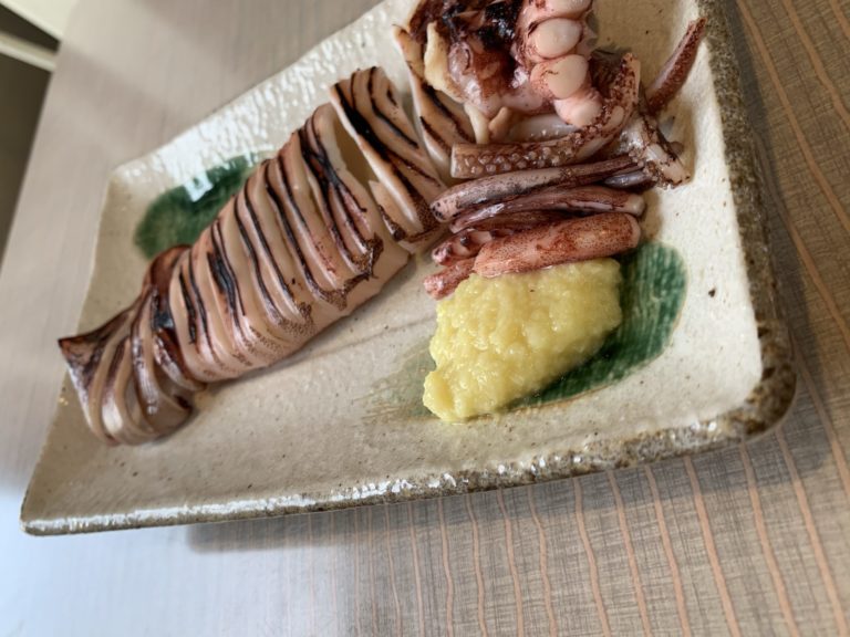 釣りたての透明なイカはやはり普段のイカとは違って美味。捌いている様子も見れるので、その点も◎。