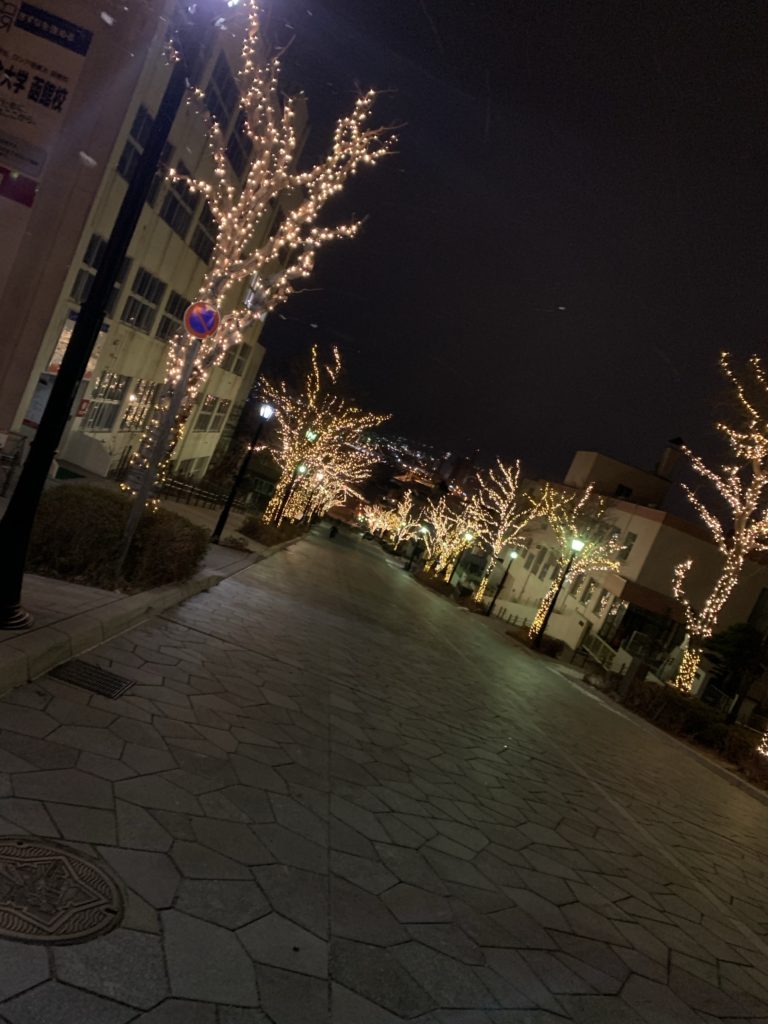 夜にはライトアップもされる、海に向かってまっすぐ伸びる一本道が美しい坂。