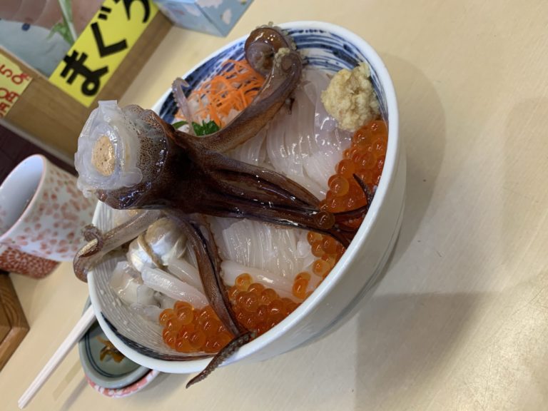 メニューの「活いか踊り丼」は商標登録もされている、函館朝市どんぶり横丁内にあるお店。