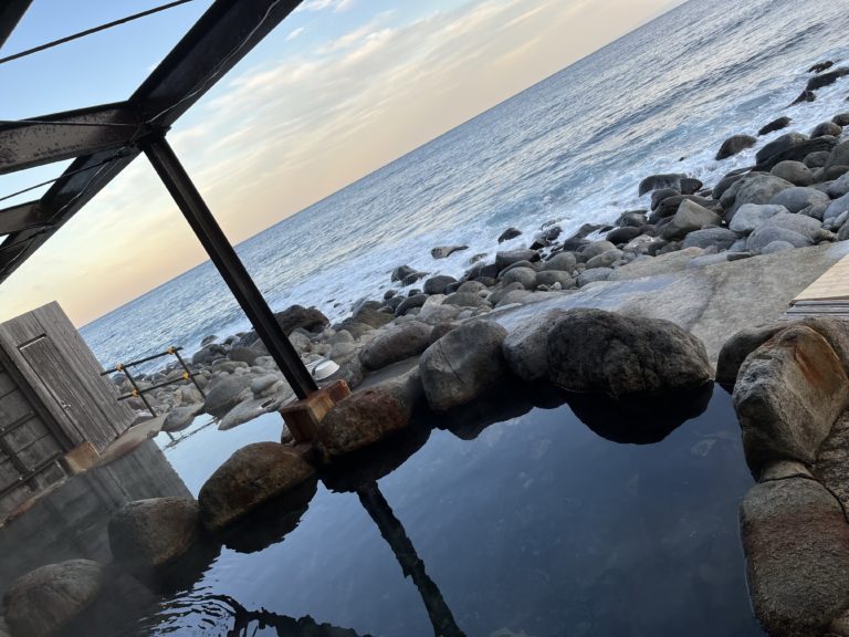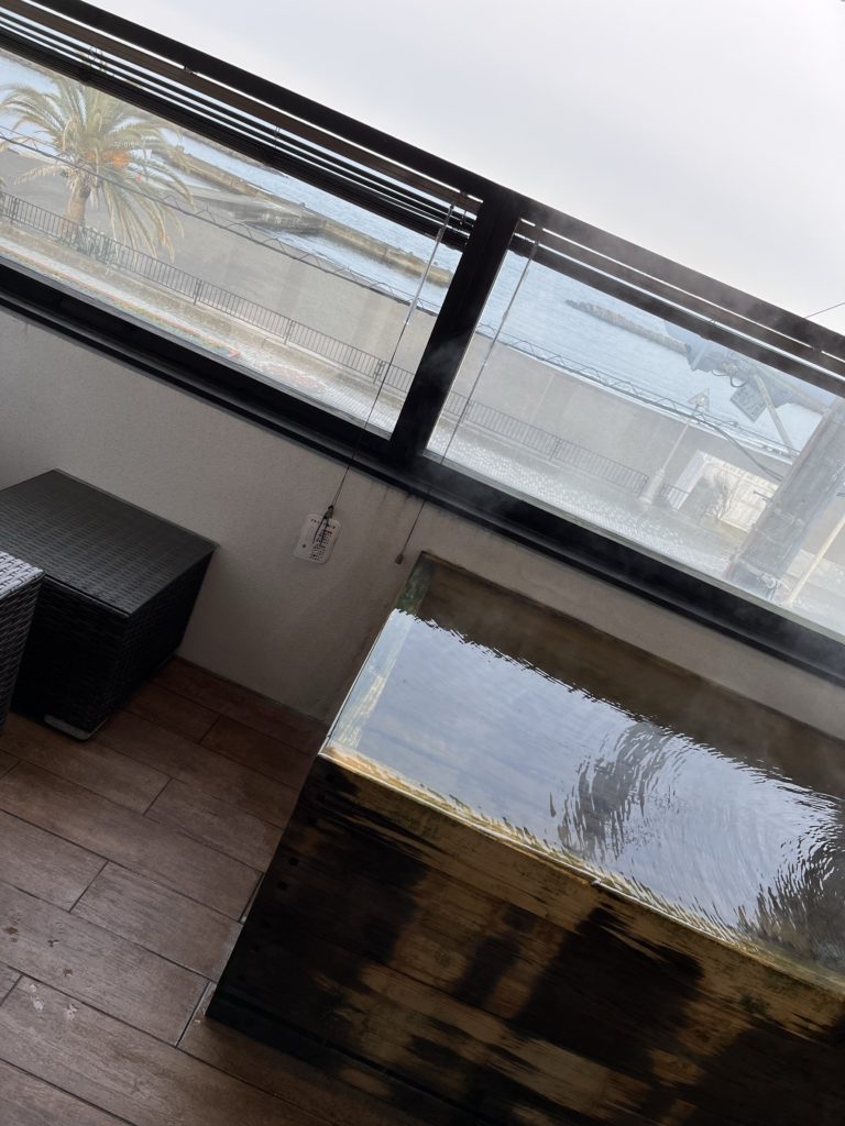 北川温泉の宿の宿泊者は無料で入れる。海抜0メートルの視点で海を眺めながら入る温泉は格別。