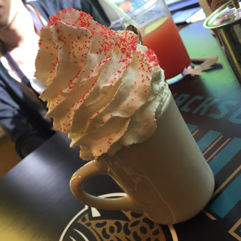 飲み物で注文したホット・チョコレートは、甘いチョコレートドリンクの上に甘いホイップクリームが乗っていて甘過ぎた。