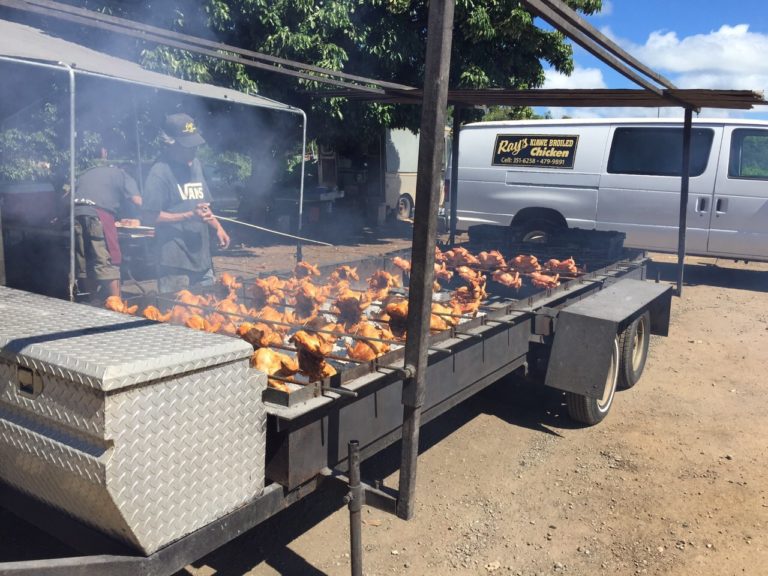 土日のみ営業しているフリフリチキン専門店。フリフリチキンとは、鶏肉をぐるぐる回しながら直火で焼かれたハワイ料理。